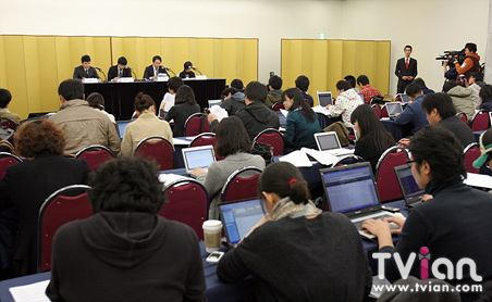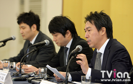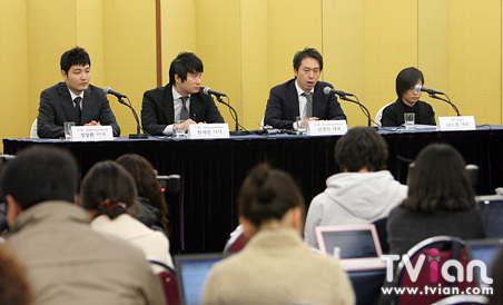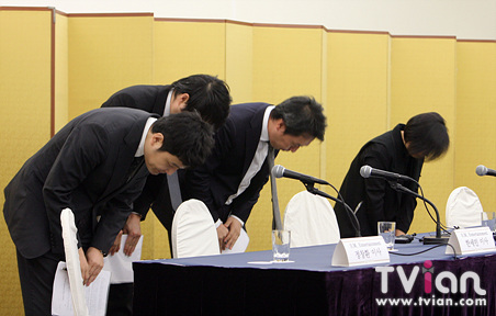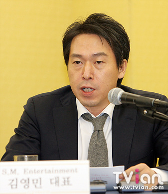 동방신기 멤버 3명이 법원에 낸 전속계약 효력정지 가처분신청 일부가 받아들여진 가운데, 2일 오후 서울 여의도 63빌딩에서 열린 영웅재중(23), 믹키유천(23), 시아준수(22) 멤버 3명의 전속계약 효력정지 가처분 신청에 대한 SM엔터테인먼트의 입장발표 기자회견에서 김영민 대표가 기자회견문을 읽고 있다.