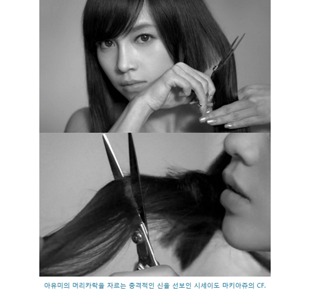 그것도 아름다운 롱 헤어를 가위로 싹둑싹둑 잘라내고 빡빡머리가 되는 매우 충격적인 광고다.