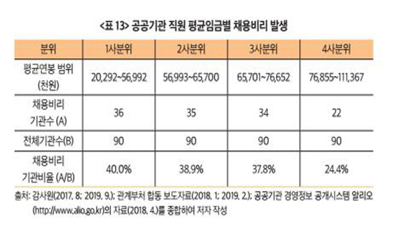 공공기관을 직원 연평균임금에 따라 4개 분위로 구분한 뒤 분위별로 채용 비리 적발 현황을 살펴본 결과, 평균임금이 5천699만원 이하에 해당하는 1분위에서 채용 비리 발생이 40%로 높게 나타났습니다.