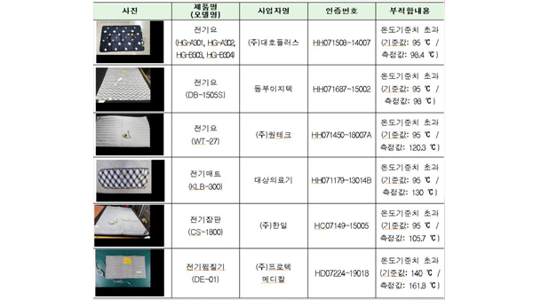 대상의료기 전기 매트의 내부온도가 130도까지 올라가 기준치인 95도보다 35도 더 높게 측정되는 등, 6개 매트가 기준치보다 온도가 더 높아 리콜 조치됐고, 2개 제품은 저온 화상 주의문구 누락 등으로 개선조치를 권고받았습니다.
