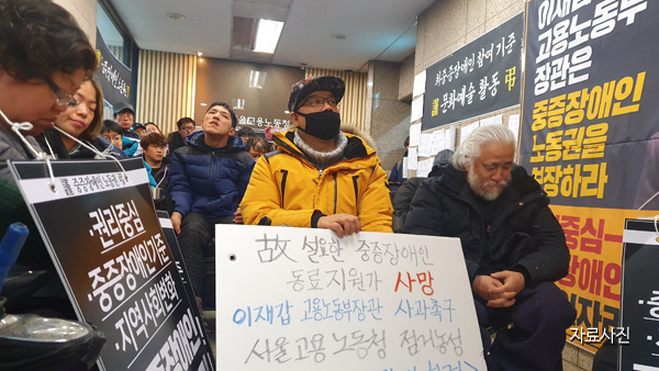 뇌병변 중증장애인이었던 설 씨는 지난해 4월부터 정부의 '중증장애인 지역맞춤형 취업지원 사업'에 참여해 전남 여수 지역의 중증장애인들의 취업을 돕는 일을 하던 중 지난달 5일 숨졌으며, 이와 관련해 농성 참가자들은 설 씨의 죽음이 과도한 실적 압박 때문이라고 주장했습니다.